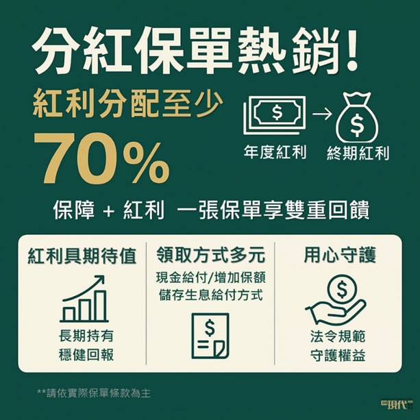 保險公司會設立獨立帳戶,由專業團隊負責操作,其投資績效決定紅利多寡,保戶與公司共享盈餘,因此,分紅並非保證給付,領取金額每年不一,但有望成為退休後的現金流來源,且不影響基本保障。分紅保單的紅利分為:「年度保單紅利」與「終期保單紅利」,業界指出,若投資操作得當,保戶可享7成以上的分配盈餘,進一步提升整體保障額度。